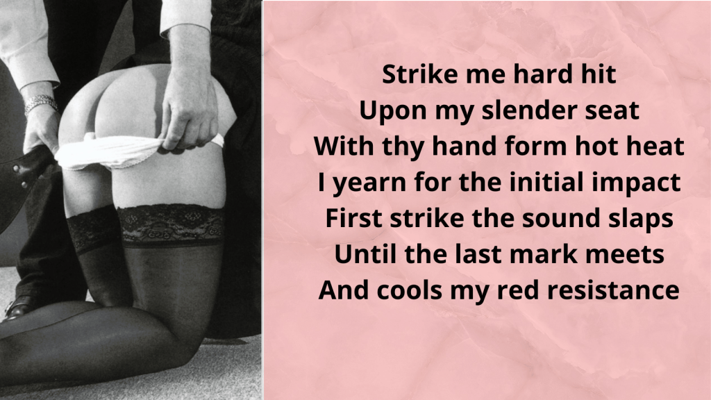 Strike me hard hit Upon my slender seat With thy hand form hot heat I yearn for the initial impact First strike the sound slaps Until the last mark meets And cools my red resistance